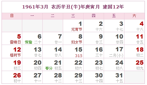 1961年3月 农历辛丑(牛)年庚寅月 建国12年