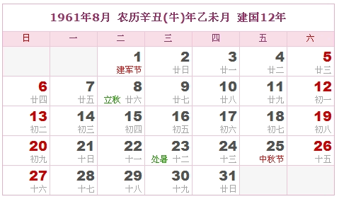 1961年8月 农历辛丑(牛)年乙未月 建国12年
