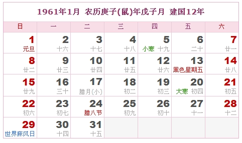 1961年1月 农历庚子(鼠)年戊子月 建国12年