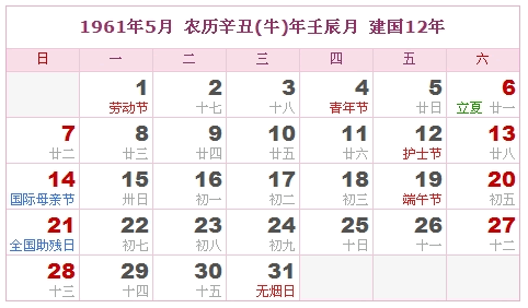 1961年5月 农历辛丑(牛)年壬辰月 建国12年