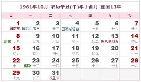 1961年10月 农历辛丑(牛)年丁酉月 建国13年