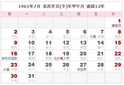 1961年7月 农历辛丑(牛)年甲午月 建国12年
