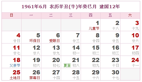 1961年6月 农历辛丑(牛)年癸巳月 建国12年