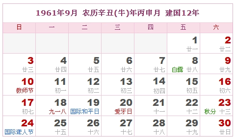1961年9月 农历辛丑(牛)年丙申月 建国12年