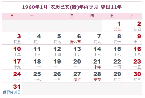 1960年日历表及1960年是什么年