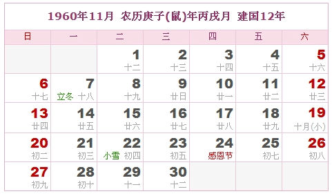 1960年11月 农历庚子(鼠)年丙戌月 建国12年