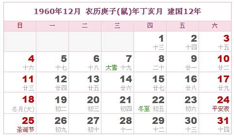1960年12月 农历庚子(鼠)年丁亥月 建国12年