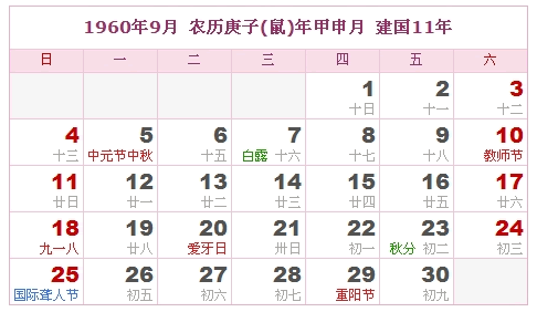 1960年9月 农历庚子(鼠)年甲申月 建国11年