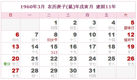 1960年3月 农历庚子(鼠)年戊寅月 建国11年