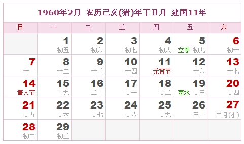 1960年2月 农历己亥(猪)年丁丑月 建国11年