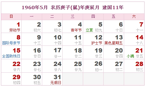 1960年5月 农历庚子(鼠)年庚辰月 建国11年