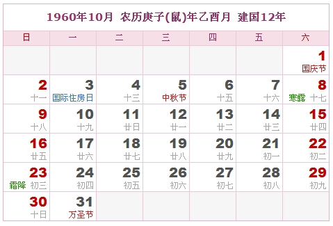 1960年10月 农历庚子(鼠)年乙酉月 建国12年