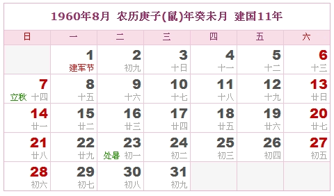 1960年8月 农历庚子(鼠)年癸未月 建国11年
