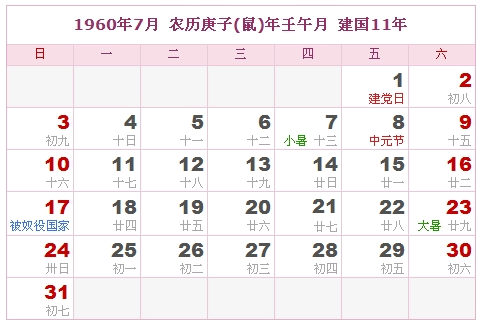 1960年7月 农历庚子(鼠)年壬午月 建国11年