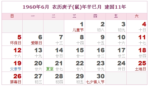 1960年6月 农历庚子(鼠)年辛巳月 建国11年