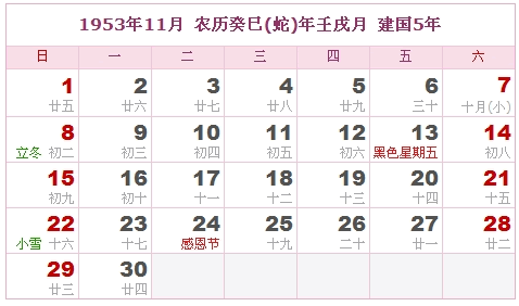 1953年11月 农历癸巳(蛇)年壬戌月 建国5年