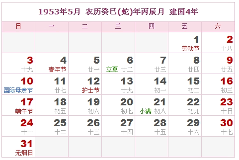 1953年5月 农历癸巳(蛇)年丙辰月 建国4年