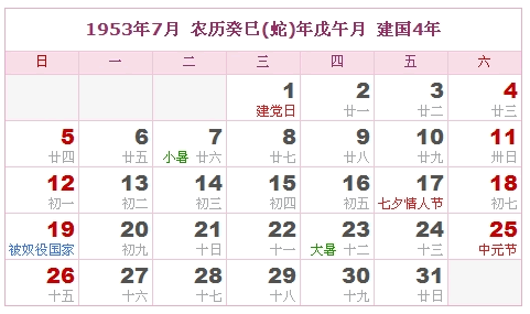1953年7月 农历癸巳(蛇)年戊午月 建国4年