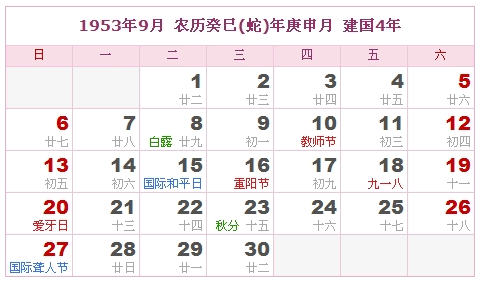 1953年9月 农历癸巳(蛇)年庚申月 建国4年