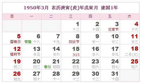 1950年3月 农历庚寅(虎)年戊寅月 建国1年