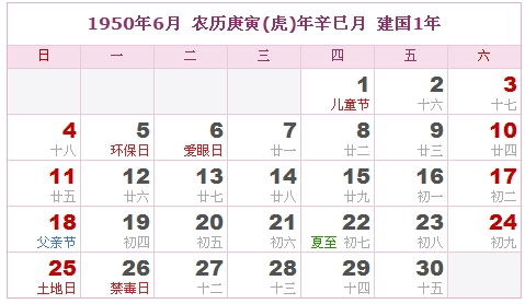 1950年6月 农历庚寅(虎)年辛巳月 建国1年