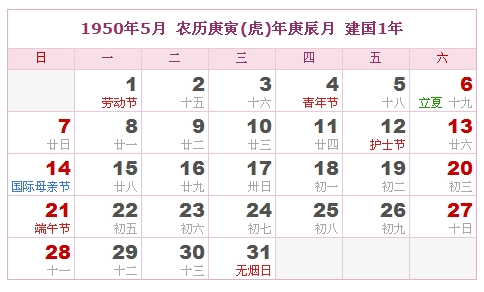 1950年5月 农历庚寅(虎)年庚辰月 建国1年