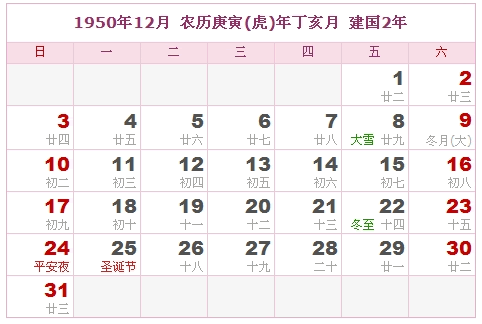 1950年12月 农历庚寅(虎)年丁亥月 建国2年