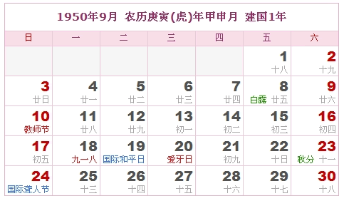 1950年9月 农历庚寅(虎)年甲申月 建国1年