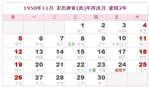 1950年11月 农历庚寅(虎)年丙戌月 建国2年