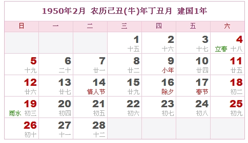 1950年2月 农历己丑(牛)年丁丑月 建国1年