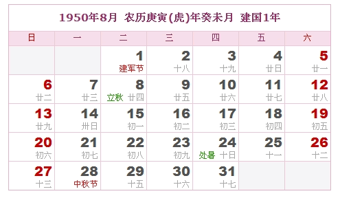 1950年8月 农历庚寅(虎)年癸未月 建国1年
