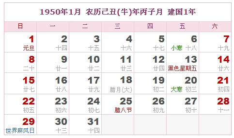 1950年1月 农历己丑(牛)年丙子月 建国1年
