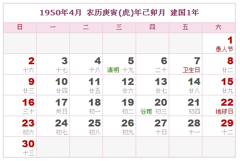 1950年4月 农历庚寅(虎)年己卯月 建国1年