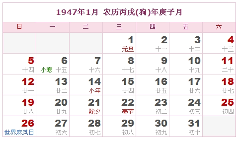 1947年1月1日-1947年2月3日为农历丙戌狗年