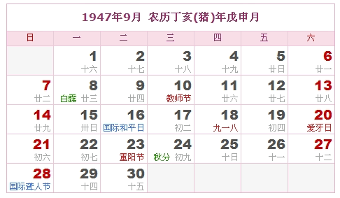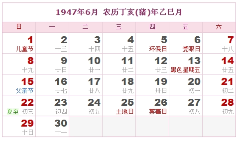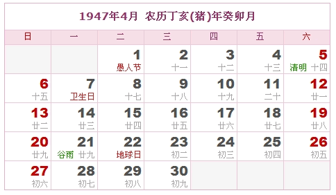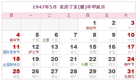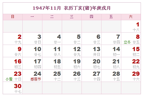 此表为1947年的日历表、1947年农历表、1947年阴历阳历对照表,含阴阳历、节日、二十四节气等。供大家参看。
