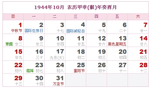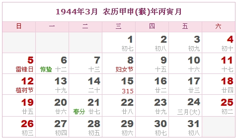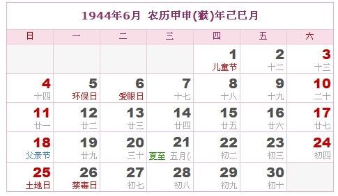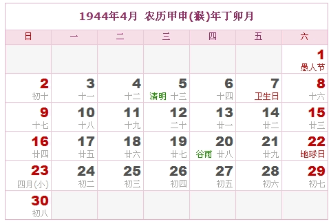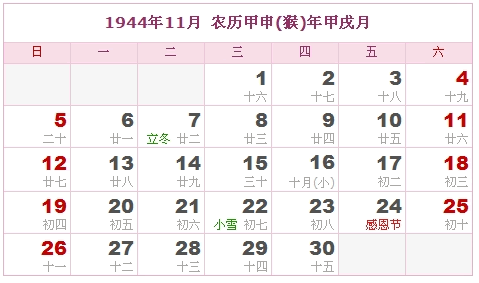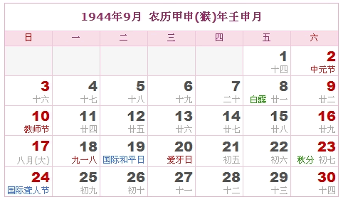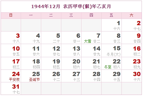 此表为1944年的日历表、1944年农历表、1944年农历阳历表,含阴阳历、节日、二十四节气等。供大家参看。