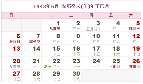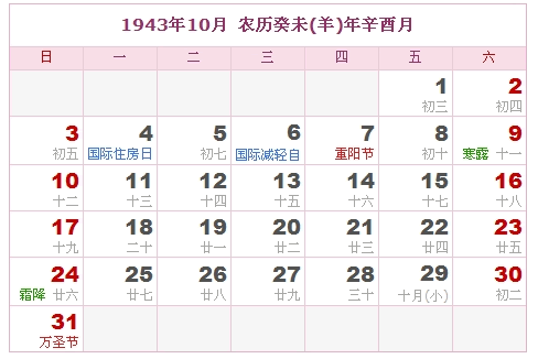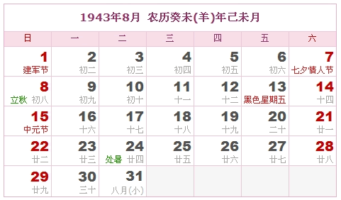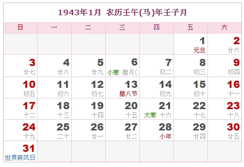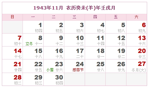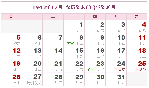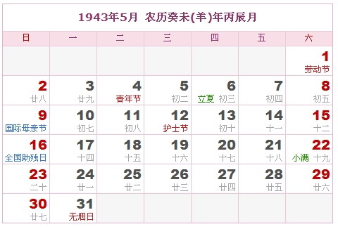 此表为1943年的日历表、1943年农历表、1943年农历阳历表,含阴阳历、节日、二十四节气等。供大家参看。