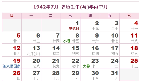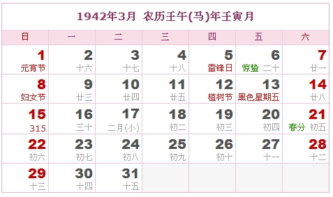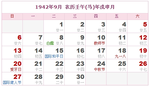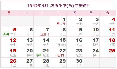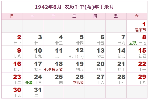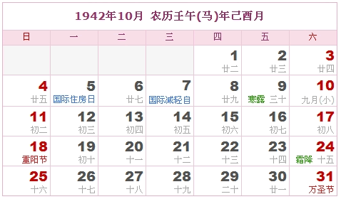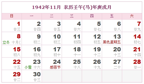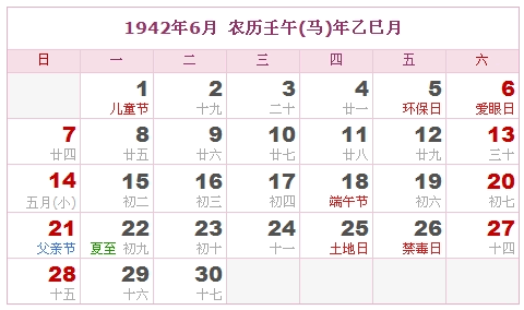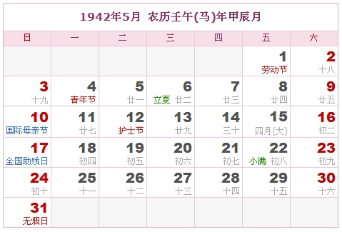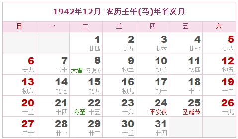 此表为1942年的日历表、1942年农历表、1942年农历阳历表,含阴阳历、节日、二十四节气等。供大家参看。