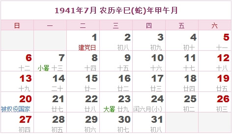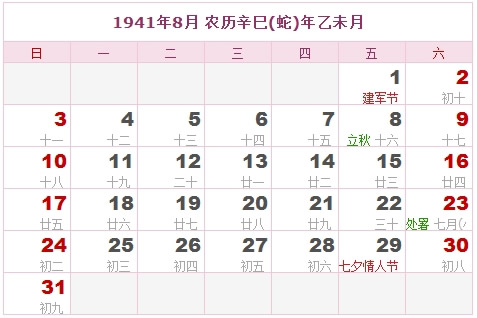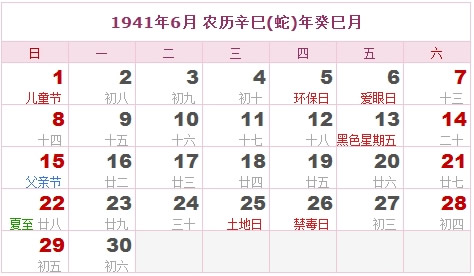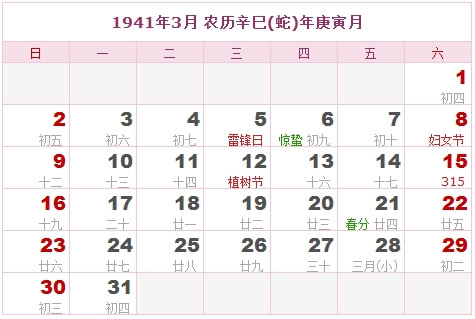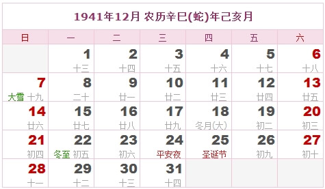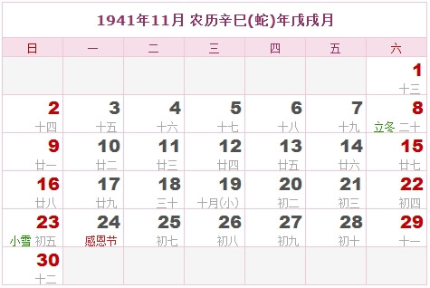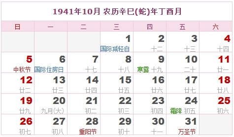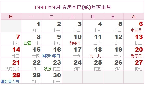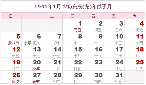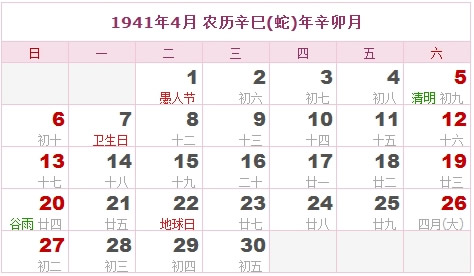 此表为1941年的日历表、1941年农历表、1941年农历阳历表,含阴阳历、节日、二十四节气等。供大家参看。